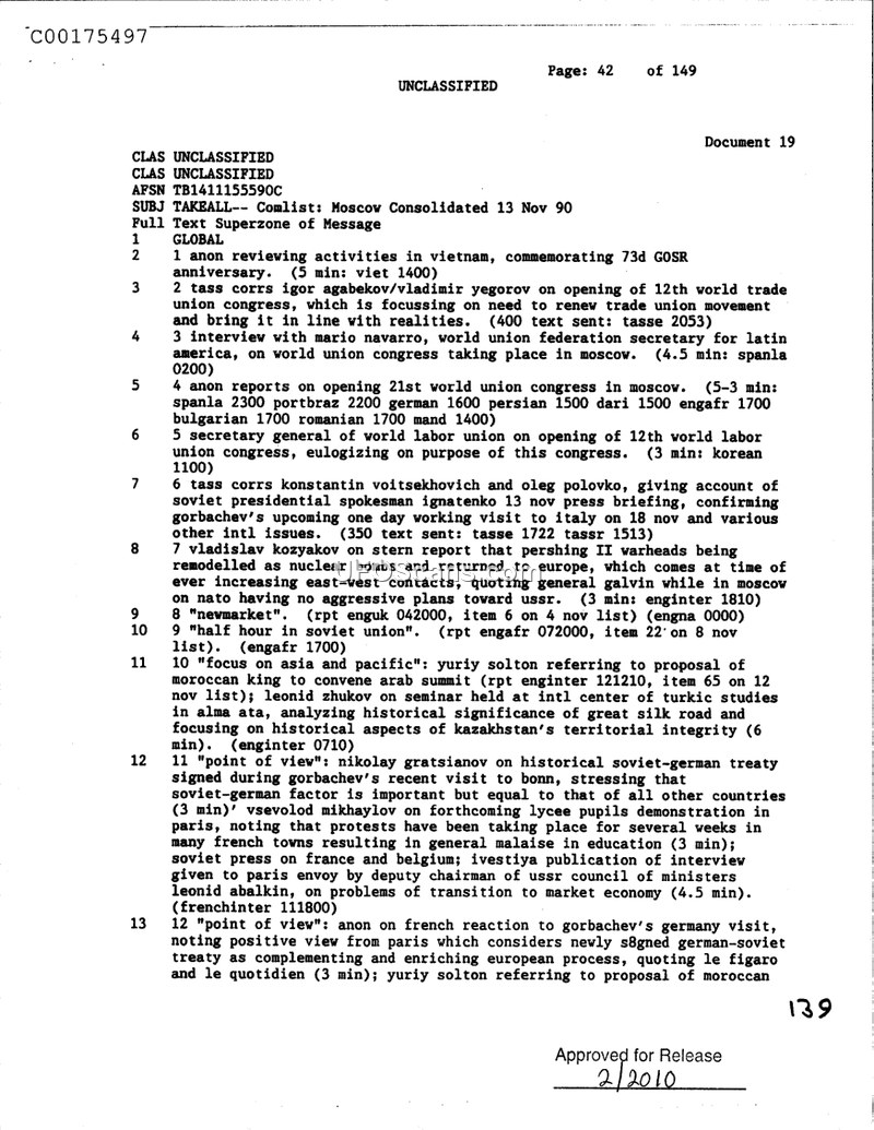 This document is a daily summary of Soviet media reports from November 13, 1990, covering global geopolitical events, Soviet internal politics, and economic reforms. It provides a detailed overview of the Soviet perspective on international relations and domestic affairs during the final years of the USSR.