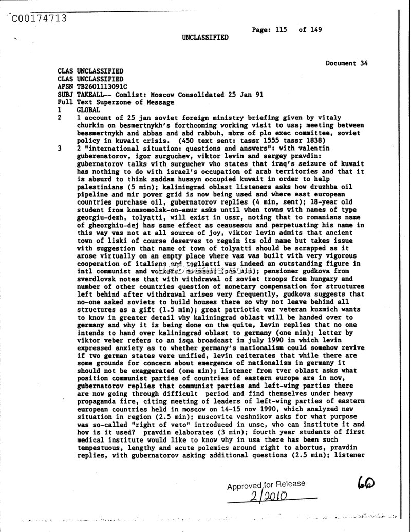 This document is a consolidated Soviet foreign ministry briefing from January 25, 1991, covering global geopolitical events, Soviet economic reforms, and internal political tensions. It includes a brief mention of a radio segment regarding the lack of official statements on UFO captures.