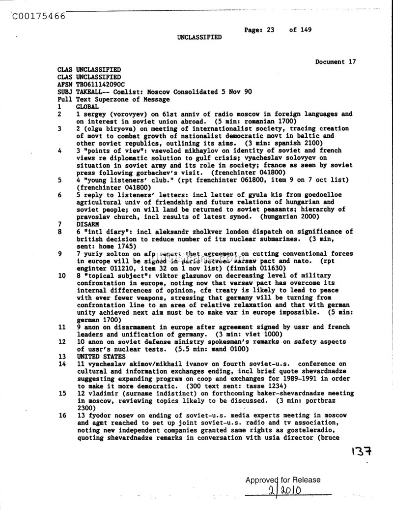 This document is a daily summary of Soviet media reports from November 5, 1990, covering domestic economic issues, international diplomacy, and political developments. It provides insight into the Soviet Union's state-controlled media narrative during the final year of its existence.