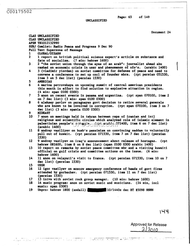 This document is a summary of a Radio Peace and Progress broadcast dated December 9, 1990. It provides a list of news items covered by the station, categorized by region. The global section includes a report on British political science regarding the fate of socialism, an analysis by journalist Ahmad Abu Rashad on the economic crisis in the USSR and the phenomenon of UFOs, and a report by Vladimir Yiordan regarding the Soviet Committee for the Defense of Peace. The Americas section covers a summit of Central American presidents, events in Panama and Argentina, and a report on the retirement of corrupt generals in Paraguay. The Mideast section details meetings in Tehran regarding the Palestinian struggle, Andrey Vasiliyev's report on President Bush's pessimism regarding Saddam Hussein's withdrawal from Kuwait, and a report on the release of hostages. The USSR section mentions an emergency conference of heads of government firms attended by Gorbachev, an interview with a Soviet rock group manager, and a music program.