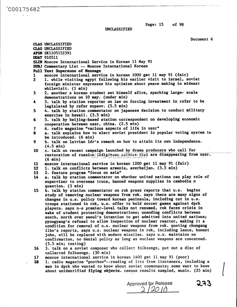 This document is a subject commentary list from the Moscow International Service, dated May 11, 1991. It provides a summary of various radio broadcasts in Korean. The topics covered in these broadcasts are diverse, ranging from international relations and political developments to cultural and social issues. Specific items include discussions on the Middle East peace process, student demonstrations in South Korea, economic cooperation between the USSR and China, and various internal Soviet affairs such as the election of a Soviet president and the preservation of indigenous cultures. Notably, item 18 mentions a radio magazine titled 'postbox' which featured a reading of letters from listeners, including a man in the Democratic People's Republic of Korea (DPRK) who inquired about Soviet cosmonauts and unidentified flying objects.