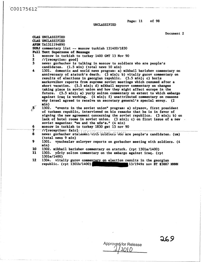 This document is a summary of a Moscow Turkish language broadcast dated 13 November 1990. It outlines a series of news reports and commentaries covering various political and social issues within the Soviet Union and international affairs. Key topics include General Secretary Gorbachev's meetings with soldiers who are candidates, commentary on the anniversary of Ataturk's death by Mikhail Barishev, and reports on the Supreme Soviet meetings by Boris Markovnikov. The broadcast also featured commentary on the Georgian Republic elections by Vitaliy Gurov, an analysis of the embargo against Iraq by Yuriy Solton, and an interview with Niyazov, the first president of the Turkmen Republic, regarding a new agreement between Soviet republics. Notably, the list includes a mention of a segment in a Soviet magazine titled 'we and the ufo's.' The document serves as a log of these broadcast segments, providing brief descriptions and durations for each item.
