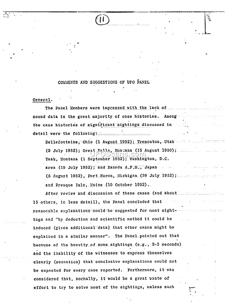 This document contains the comments and suggestions of the Scientific Advisory Panel on Unidentified Flying Objects, which met from January 14-17, 1953. The Panel reviewed numerous case histories, including sightings from Tremonton, Utah; Great Falls, Montana; and Washington, D.C. The Panel members expressed concern over the lack of sound data in the majority of reports, noting that many sightings were too brief or poorly documented to allow for scientific analysis. They concluded that there was no evidence of a direct threat to national security from the objects reported. The Panel discussed the history of 'Foo Fighters' from World War II, suggesting they were likely natural phenomena such as electrostatic or electromagnetic effects. A significant portion of the report focuses on the Air Force's reporting system, which the Panel argued was being overwhelmed by low-quality reports, partly due to public pressure and media influence. The Panel recommended a broad educational program aimed at 'training and debunking' to help the public and military personnel better identify common objects like balloons, aircraft reflections, and meteors. This, they argued, would reduce the burden on intelligence channels and allow for better focus on potential unconventional threats. The Panel also addressed the Tremonton, Utah, sighting, which involved motion picture film. After reviewing the analysis by the USN Photo Interpretation Laboratory, the Panel remained skeptical of the conclusion that the objects were self-luminous, suggesting instead that they were likely birds or reflections. The document concludes with recommendations for future instrumentation, such as radar-scope cameras, and a warning to monitor unofficial groups like the 'Civilian Flying Saucer Investigators' and the 'Aerial Phenomena Research Organization' for potential subversive influence.