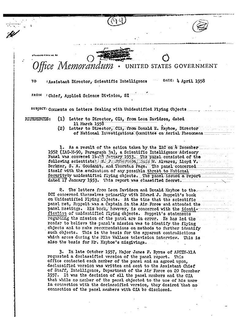 This memorandum, dated April 4, 1958, from the Chief of the Applied Science Division to the Assistant Director of Scientific Intelligence, addresses concerns regarding letters received from Leon Davidson and Donald E. Keyhoe. The correspondence centers on the 1953 Scientific Intelligence Advisory Panel, which had been convened by the Intelligence Advisory Committee (IAC) in December 1952 to evaluate the threat posed by Unidentified Flying Objects. The panel, consisting of H. P. Robertson, Luis W. Alvarez, Lloyd V. Berkner, S. A. Goudsmit, and Thornton Page, had concluded that UFOs did not pose a direct physical threat to national security and recommended stripping the subject of its 'special status' and 'aura of mystery.' The memorandum notes that Edward J. Ruppelt’s book on UFOs and a subsequent television interview with Mike Wallace had created public confusion regarding the panel's mission. Major James F. Byrne of AFIC-XIA had requested a declassified version of the panel's report in late 1957, which was subsequently provided to the Air Force. The memorandum emphasizes that the panel members and the CIA were adamant that no association between the panel members and the CIA be disclosed to the public. The author suggests that the Air Force should handle the release of the declassified report to avoid revealing this connection.