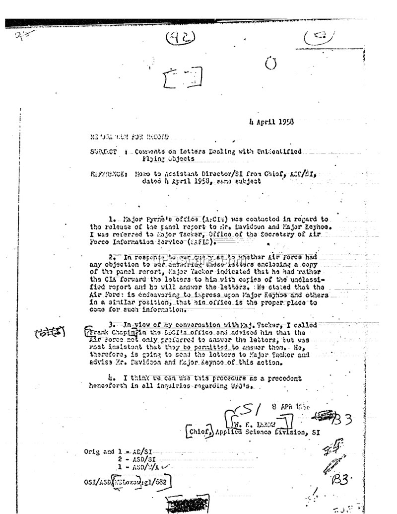 This memorandum for the record, dated April 4, 1958, outlines the administrative procedure for handling external inquiries regarding Unidentified Flying Objects (UFOs). The author, W. E. Lexow of the Applied Science Division, SI, details his efforts to coordinate the release of a panel report to Mr. Davidson and Major Keyhoe. After initially contacting Major Byrne's office, Lexow was directed to Major Tacker at the Office of the Secretary of Air Force Information Service (SAFIS). Major Tacker indicated that the Air Force preferred to handle such inquiries directly, requesting that the CIA forward relevant letters to his office, where they would be answered with copies of unclassified reports. Following this, Lexow consulted with Frank Chapin, who confirmed that the Air Force was insistent on managing these responses. Consequently, Lexow proposed that this method of referring UFO-related inquiries to the Air Force should serve as a formal precedent for all future correspondence on the subject.