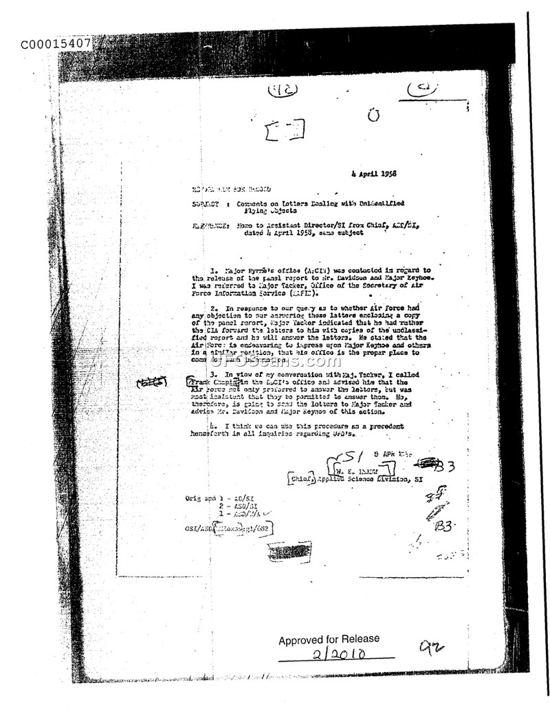 This memorandum, dated 4 April 1958, documents a procedural decision regarding the handling of public inquiries about Unidentified Flying Objects (UFOs). The author, identified as the Chief of the Applied Science Division, SI, recounts an initial attempt to contact Major Fyrre's office regarding the release of a panel report to Mr. Davidson and Major Keyhoe. The author was subsequently referred to Major Tacker at the Office of the Secretary of Air Force Information Service (SAFIC). Following a discussion with Major Tacker, it was determined that the Air Force would handle these inquiries directly by providing copies of the unclassified report to the requesters. The author then coordinated with Frank Chapin of the CIA to ensure that the Air Force would take responsibility for answering these letters. The memorandum concludes by proposing that this method of referring UFO-related inquiries to the Air Force be adopted as a standard precedent for all future correspondence on the subject.