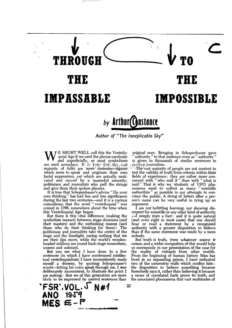 In this article, Arthur Constance explores the intellectual and social barriers that prevent humanity from accepting the reality of UFO phenomena. He characterizes the current era as a 'Ventriloquial Age,' where the majority of people rely on the opinions of 'authorities'—politicians, journalists, and scientists—rather than engaging in independent thought or critical analysis of evidence. Constance argues that these authorities often operate within self-imposed 'impassable walls' of conventional wisdom, which prevent them from acknowledging truths that fall outside their established paradigms. He highlights the historical tendency of scientific experts to dismiss new or unconventional information, citing his own experience with a biological description of the Cyclothone fish, which was initially rejected by an authority despite being factually accurate. The author contends that the study of UFOs is hindered by this same dogmatic approach, where scientists refuse to examine data that contradicts their existing beliefs. He advocates for a more rigorous and open-minded investigation, suggesting that the 'impassable' walls of current scientific thought are already beginning to crumble. Constance also touches upon the concept of precognition and the failure of past scientific forecasts, using these as examples of how consensus opinion can be fundamentally wrong. Ultimately, the article serves as a critique of intellectual conformity and a call for a more objective, evidence-based approach to the study of unidentified aerial phenomena, urging readers to look beyond the limitations of contemporary scientific orthodoxy.