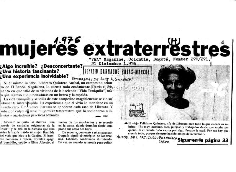 A 1976 magazine article reports on the claims of a Colombian farmer, Liberato Quintero Aníbal, who alleges an abduction and sexual encounter with extraterrestrial beings. A local doctor confirms the presence of physical marks on the farmer's arm but remains neutral regarding the origin of the event.