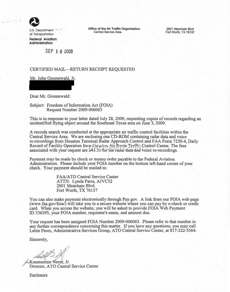 This document consists of a Freedom of Information Act (FOIA) response from the Federal Aviation Administration (FAA) to John Greenewald, Jr., regarding a request for records of an unidentified flying object reported in Southeast Texas on June 3, 2009. The FAA provided a CD-ROM containing radar data and voice recordings, along with copies of the Daily Record of Facility Operation for Houston Terminal Radar Approach Control (TRACON) and the Houston Air Route Traffic Control Center (ZHU). The records indicate that on May 29, 2009, at 0120 UTC, the pilot of flight BTA2822 (an E145 aircraft) reported seeing a missile pass 100-200 feet below his aircraft while at 13,000 feet, approximately 20 miles southeast of IAH. The report was relayed to ZHU and 190. The Liberty County Sheriff's Department was notified, and the incident was broadcast on the ATIS at IAH for one hour. A Quality Assurance Review (QAR) form filed on May 29, 2009, by an ATCS (initials RB/L) noted that no radar target was displayed at 190 or ZHU during the event. The investigation concluded that no phraseology or technical issues were identified and that all other ATC services were normal.