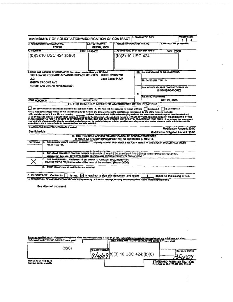 This document is an official Amendment of Solicitation/Modification of Contract (P00001) for contract number HHM402-08-C-0072, issued on September 2, 2009. The contractor is Bigelow Aerospace Advanced Space Studies, located in North Las Vegas, Nevada. The purpose of this modification is to extend the current period of performance to September 30, 2009, and to revise the option year dates to cover the period from October 1, 2009, to September 30, 2010. Furthermore, the modification formally exercises the option year, contingent upon the availability of appropriated funds as stipulated under FAR 52.232-18. The document includes a schedule of services for the option year, which encompasses monthly status reports, project management plans for tasks 3.a.1 through 3.a.12, research reports for the same tasks, a comprehensive integrated threat assessment, travel, and other direct costs. The document also references the original contract (Standard Form 1449) dated September 22, 2008, which had a total award amount of $10,000,000.00.