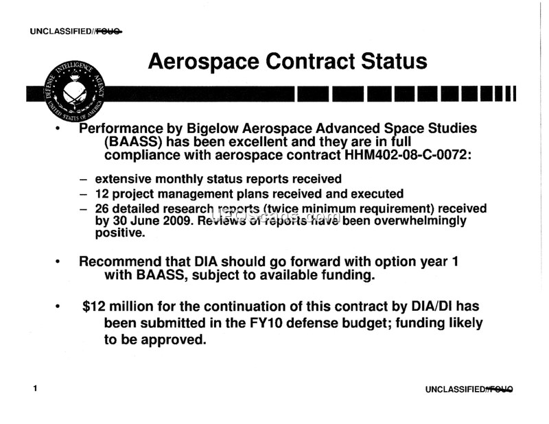 This briefing confirms the successful performance of Bigelow Aerospace Advanced Space Studies (BAASS) under contract HHM402-08-C-0072 and outlines plans for contract extension and future deliverables. It details a wide range of advanced research topics, including warp drives and antigravity, and notes the program's potential transition to a Special Access Program.