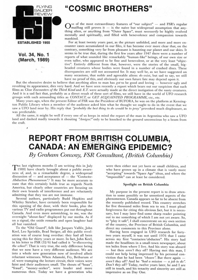 This issue of Flying Saucer Review (Vol. 34, No. 1, March 1989) serves as a compilation of reports and commentary on the state of UFO and abduction research. The editorial content challenges the assumption that extraterrestrial entities are inherently benevolent, noting that historical reports of 'human-like' beings have shifted toward more disturbing accounts of small, large-headed entities. The document features a report by Graham Conway regarding the 'Contactee-Abduction Phenomenon' in British Columbia, Canada. Conway details his experiences with various abductees, noting commonalities such as physical implants, poltergeist-type activity, and psychological trauma. He discusses the challenges of documenting these cases, including the reluctance of witnesses and the emotional toll on those involved. The text also touches upon the 'light people'—beings reported by some contactees during sleep—and the recurring theme of sexual assault and physical scarring among abductees. Additionally, the document includes a summary report by F.C. Taylor of Circles Phenomenon Research regarding the 1988 crop circle phenomenon in England. Taylor highlights the work of Dr. Terence Meaden, who has investigated the circles and dismissed conventional explanations like hoaxes or meteorological events, though the mystery remains unsolved. The publication reflects the broader discourse within the UFO research community of the late 1980s, characterized by a transition from simple sighting reports to complex, often distressing, accounts of human-alien interaction.
