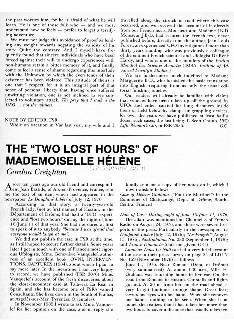 This document, published in the Flying Saucer Review, details the alleged UFO abduction of twenty-year-old Hélène Giuliana in June 1976 near the Pont de Martinet in France. According to the report, Giuliana was driving home from Romans to Hostun when her car stalled and the lights failed. She reported seeing a dome-shaped orange object. Following this event, she experienced a two-hour gap in her memory. Under hypnosis conducted by Stéphane Dey, she recounted being taken by two small beings into a craft with a rounded, iron-like interior. She described being placed on a table and restrained with handcuffs and a towel over her forehead. The account was investigated by the OURANOS Study Group and reported in various French publications. The document also includes a separate article by T. Scott Crain, Jr., regarding the 1956 crash of an F-51D aircraft piloted by Lt. Colonel Joseph Lee Merkel. Crain argues that official reports on the crash were censored to obscure the potential involvement of a UFO, noting that the pilot reported an unidentified aircraft on his radar shortly before the crash. The document serves as a compilation of these two distinct cases, emphasizing the investigative efforts of ufologists in France and the United States to document phenomena that they believe are being suppressed or ignored by official channels.