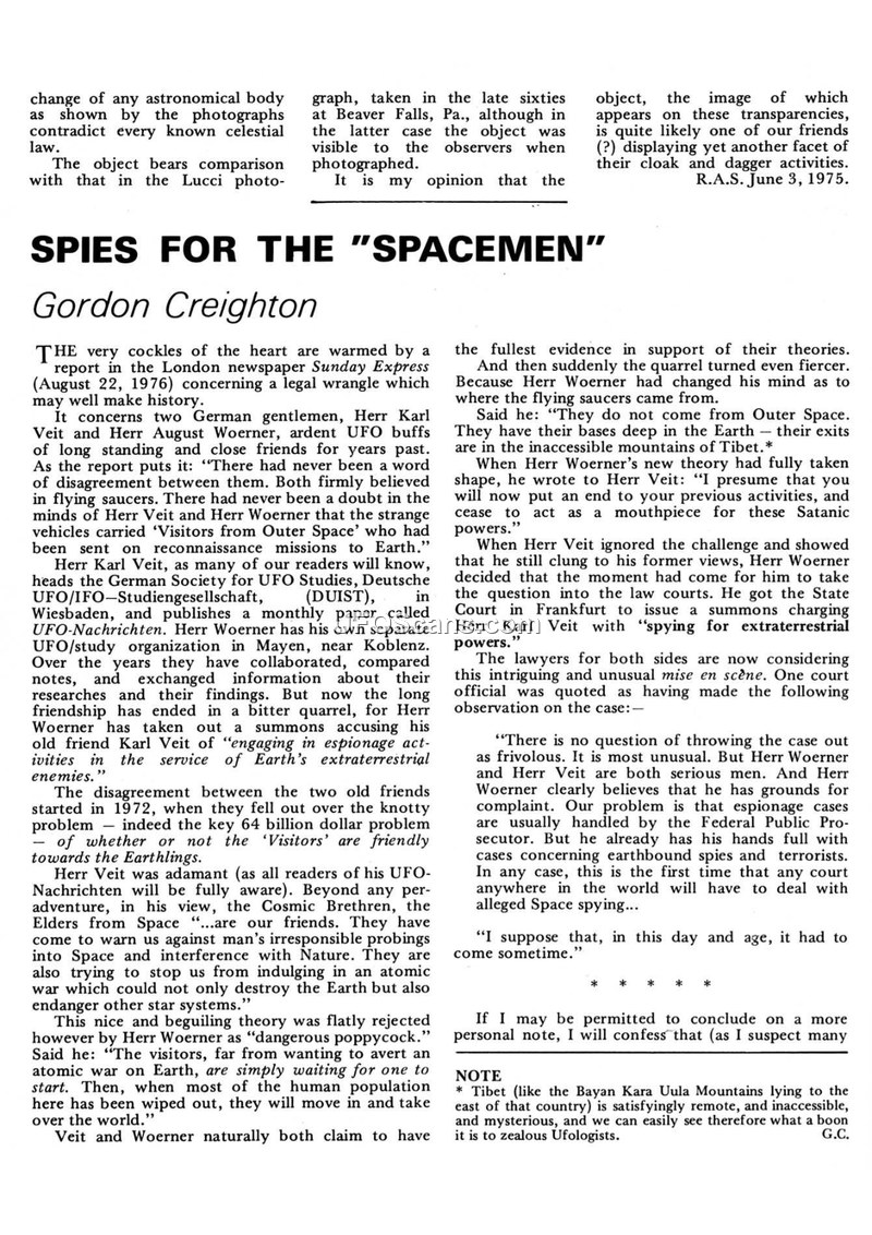 This document, written by Gordon Creighton, details a legal dispute between two prominent German UFO researchers, Karl Veit and August Woerner. Historically, the two men were close friends and collaborators, with Veit heading the German society for UFO studies (DUIST) and Woerner operating his own UFO study organization in Mayen. Their relationship deteriorated in 1972 due to conflicting theories regarding the origin of UFOs. Veit maintained that the 'Visitors' were from outer space, while Woerner argued that they originated from within the Earth, specifically the mountains of Tibet. The conflict escalated to the point where Woerner accused Veit of being a mouthpiece for 'satanic powers' and Veit initiated legal action, leading to a summons in a Frankfurt court charging Woerner with 'spying for extraterrestrial powers.' The document notes that the court found the case unusual, as it involved espionage allegations regarding extraterrestrial entities, a matter the Federal Public Prosecutor had not previously encountered. The text also includes a personal note from the author regarding his own views on the subject and a list of various UFO and space-related publications available for purchase.