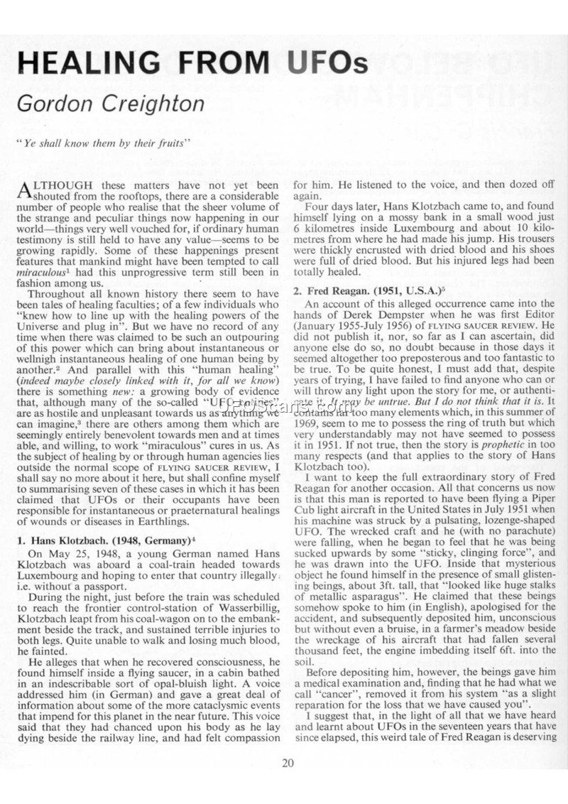 This article, written by Gordon Creighton for the Flying Saucer Review, examines the phenomenon of alleged healing of humans by UFO occupants. Creighton presents seven specific cases spanning from 1948 to 1968, involving individuals from Germany, the United States, Brazil, and Peru. The cases include Hans Klotzbach, who claimed to be healed after a train accident in 1948; Fred Reagan, who alleged his cancer was removed by beings in 1951; Buck Nelson, who reported relief from lumbago and neuritis; and Deputy Robert Goode, who claimed a bite wound was healed in 1965. Additionally, the article discusses a case involving a Brazilian woman, 'Miss Laiz,' treated for cancer in 1957, a French doctor referred to as 'Dr. X' healed in 1968, and a Peruvian customs official cured of myopia and rheumatism in 1968. Creighton acknowledges the skepticism surrounding these accounts, noting that many are difficult to authenticate and may seem preposterous. However, he argues that the existence of these reports, regardless of their factual accuracy, is a significant phenomenon that requires objective investigation. He emphasizes that the Flying Saucer Review aims to examine these claims with care, despite the potential for ridicule or the possibility that some accounts are fabricated. The article also includes advertisements for various UFO-related publications, reflecting the broader interest in the subject during the period.