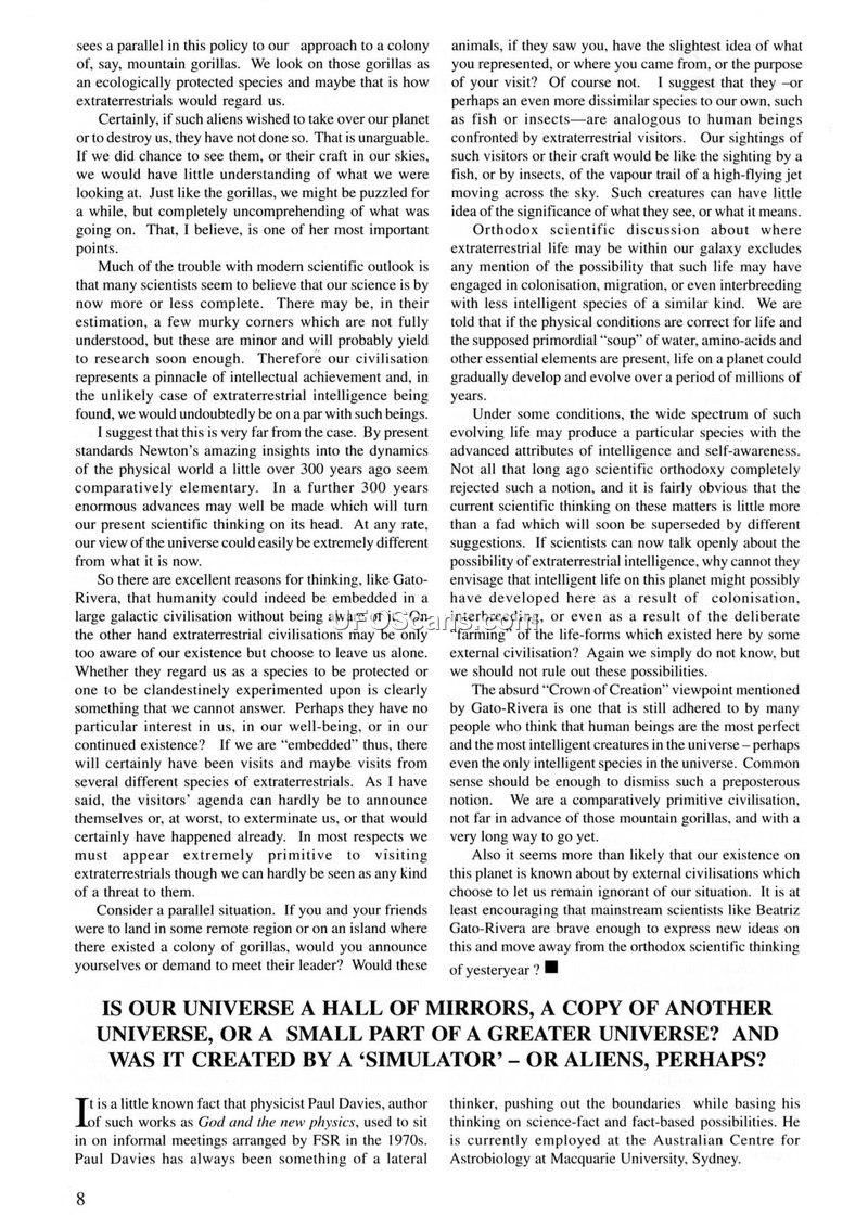 This document is a compilation of articles and reports concerning the nature of the universe, the multiverse theory, and a specific UFO sighting incident. The text begins by exploring the philosophical and scientific implications of extraterrestrial intelligence, referencing the work of physicist Paul Davies and particle physicist Beatriz Gato-Rivera. It challenges the 'Crown of Creation' viewpoint, suggesting that humanity may be a primitive civilization compared to others. The narrative shifts to a discussion on the 'multiverse' theory, citing cosmologists like Max Tegmark and Leonard Susskind, who propose that our universe may be one of many, potentially simulated or part of a larger, complex structure. The document then transitions to a report on a UFO sighting that occurred on November 1, 2002, between Afyon and Yalova, Turkey. It describes an incident where a meteor entering the atmosphere was reportedly broken into pieces by a UFO. This event was witnessed by six airline pilots from Sun Express Air and Inter Air, and was captured on video by an amateur camera. The document lists the flight crews involved, including Captains Erkan Eken, Yilmaz Atli, and Salih Gonuc, along with their respective first officers.