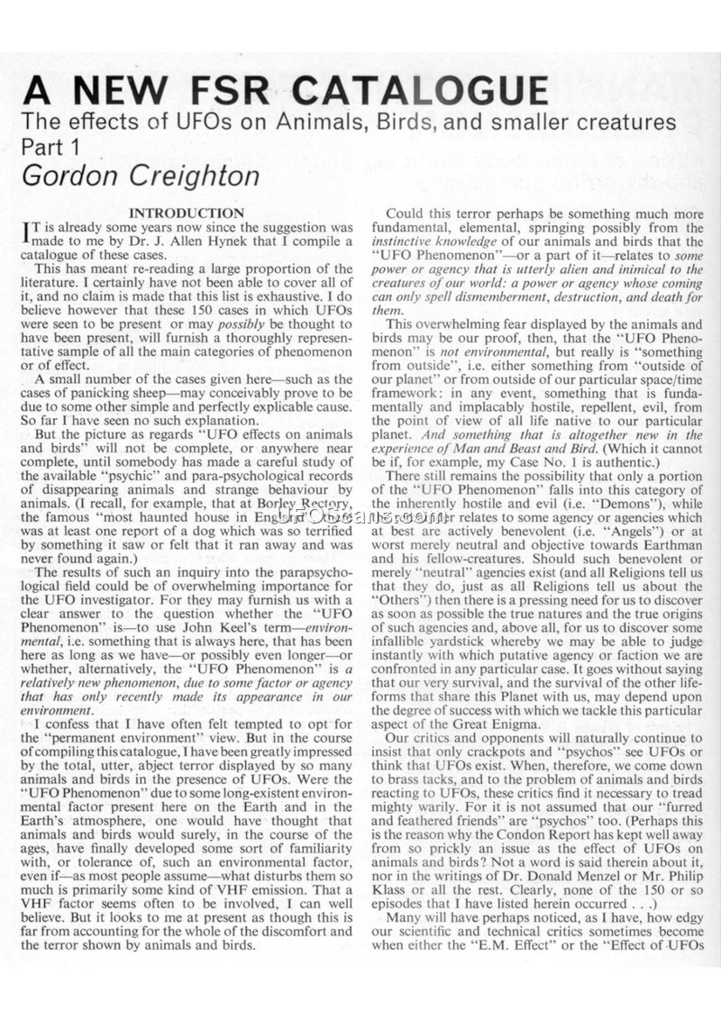 A NEW FSR CATALOGUE: The effects of UFOs on Animals, Birds, and smaller creatures Part 1