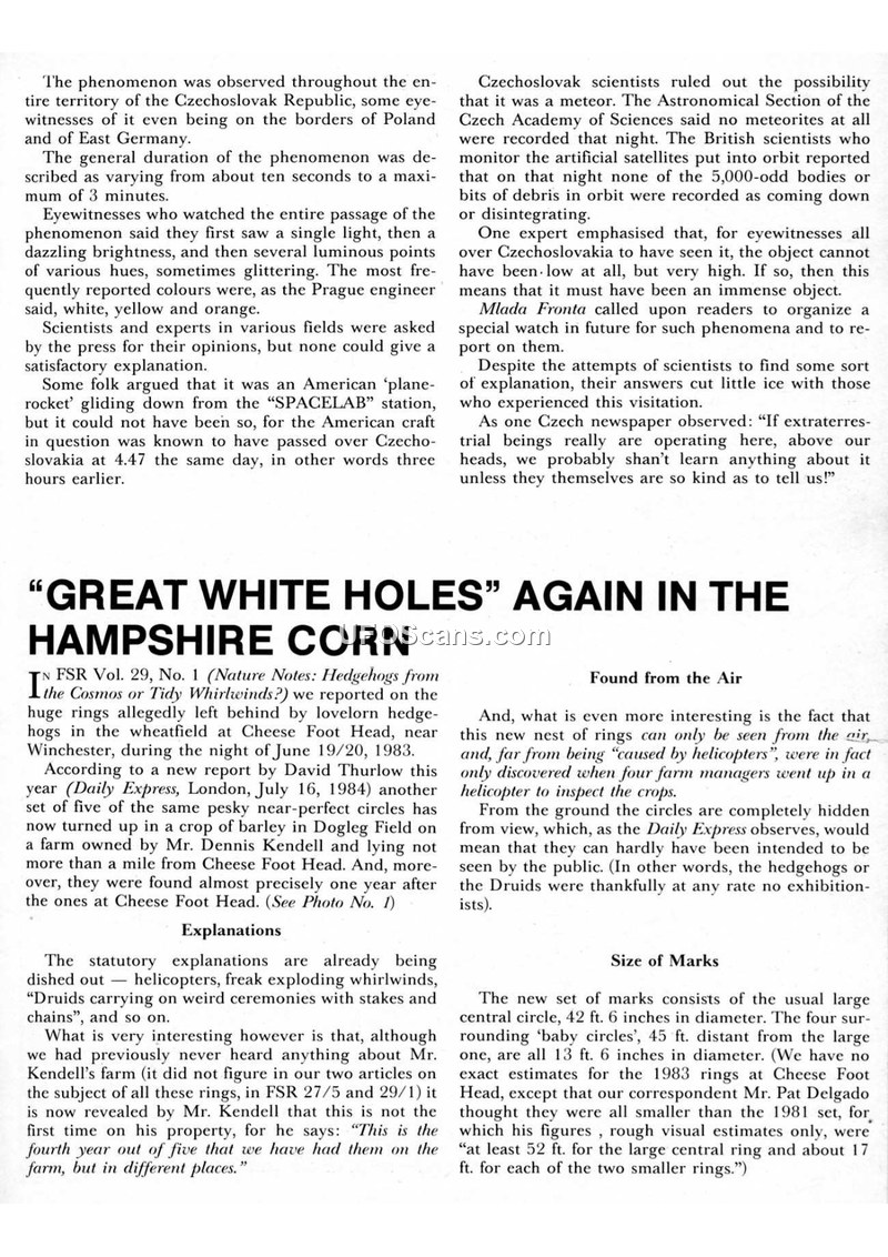 This document is an issue of the Flying Saucer Review (FSR), Vol. 29, No. 2. It contains a collection of reports and correspondence regarding Unidentified Aerial Phenomena (UAP) and crop circle formations. The first section details a phenomenon observed across Czechoslovakia, where witnesses reported a bright, multi-colored object. Scientists in the region, including the Astronomical Section of the Czech Academy of Sciences, ruled out meteors or satellite debris, leaving the event unexplained. The text also discusses the recurring 'Great White Holes' or crop circles found in Hampshire, England, specifically on the farm of Mr. Dennis Kendell. These formations, which appeared over several years, were noted for being visible only from the air and lacking 'linking tracks' on the ground. The document includes commentary from various journalists, such as David Thurlow and Jean Rook of the Daily Express, and mentions the involvement of public figures like Denis Healey. Additionally, the issue features a 'Mail Bag' section with correspondence from readers and researchers, including a letter from Aimé Michel addressing rumors of his death. The document concludes with an announcement regarding the appointment of Antonio Ribera as a consultant for FSR and a teaser for upcoming reports on abduction cases in Spain and Brazil.