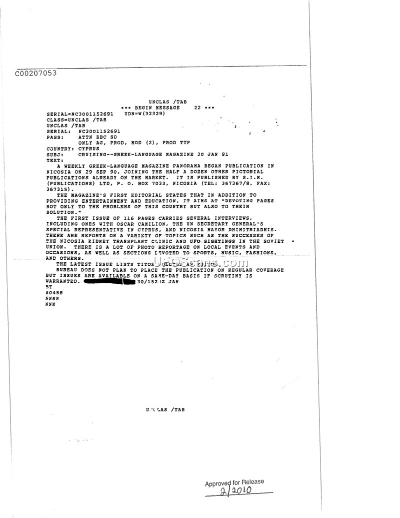 This document is an intelligence assessment regarding the launch of a new Greek-language magazine titled Panorama, based in Nicosia, Cyprus. The publication, produced by S.I.M. (Publications) Ltd., began its operations on September 29, 1990. The assessment notes that the magazine's editorial focus includes entertainment, education, and coverage of local and international events. Specifically, the document highlights that the magazine's first issue, consisting of 116 pages, features interviews with prominent figures such as Oscar Camilion, the UN Secretary General's special representative in Cyprus, and the Mayor of Nicosia, Dhimitriadhis. Furthermore, the document explicitly mentions that the magazine contains reports on a variety of topics, including UFO sightings in the Soviet Union, alongside standard sections covering sports, music, and fashion. The document identifies Titos [illegible] Olotas as the editor of the publication and notes that the bureau does not intend to provide regular coverage of the magazine, though issues are available if scrutiny is warranted.