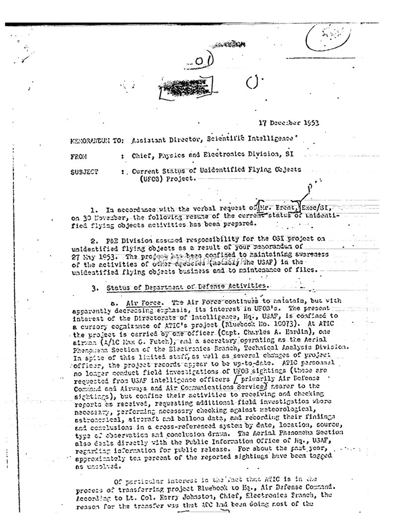 This memorandum, dated 17 December 1953, was prepared by the Chief of the Physics and Electronics Division, SI, for the Assistant Director of Scientific Intelligence. It provides a status update on the Unidentified Flying Objects (UFOs) project following a request from Mr. Erent. The document outlines that the Physics and Electronics Division maintains awareness of other agencies' activities, specifically the USAF. The Air Force's interest in UFOs is described as having 'apparently decreasing emphasis.' The project, known as Project Bluebook (No. 10073), is currently managed by one officer, Capt. Charles A. Hardin, and one airman, A/1C Max G. Futch, within the Aerial Phenomena Section of the Electronics Branch at ATIC. The document notes that ATIC is in the process of transferring Project Bluebook to the Air Defense Command (ADC). Lt. Col. Harry Johnston, Chief of the Electronics Branch, indicated that the transfer was due to the ADC performing most of the investigative work and being the command responsible for action if UFOs were identified as hostile. The memorandum also details a past effort to distribute 74 cameras with gratings to ADC radar sites to photograph UFOs, noting that 90 percent of the gratings were defective and required replacement. Additionally, it mentions that Project STORK is preparing a comprehensive statistical report on UFO sightings from 1947 through 1952, expected by 15 December 1953. The Navy is reported to have only one analyst assigned to the subject, and the Army is described as having little interest beyond cooperating with the Air Force. Finally, the document references recommendations from an OSI panel, which suggested stripping UFOs of their 'special status and aura of mystery' and noted that recent books by Keyhoe, Leslie, and Adamski were exploiting the subject, with the latter described as 'nonsensical and obviously fraudulent.'