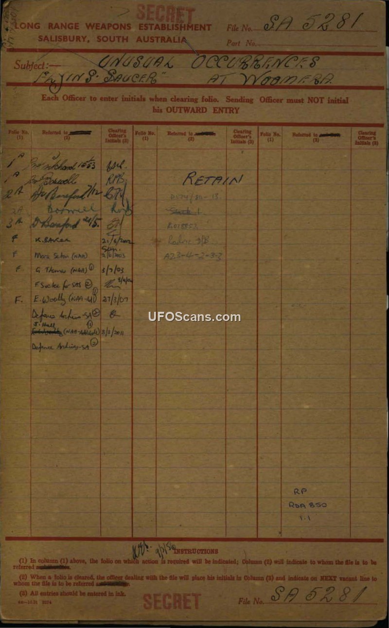 This document file, designated SA 5281, serves as a compilation of reports and correspondence regarding 'unusual occurrences' and 'flying saucers' observed at the Long Range Weapons Establishment (LRWE) in Woomera, South Australia, between 1952 and 1955. The file documents a series of sightings by military personnel, radar operators, and civilians. Notable incidents include a radar-tracked target on 8 October 1952, which was later attributed by security officers to meteorological phenomena such as ice clouds, and a sighting on 27 September 1952 by multiple witnesses at the Woomera West Open Air Theatre, who described a cigar-shaped object with lights. The file also contains correspondence from the Department of Air regarding the 'Australian Flying Saucer Research Society,' which had requested contact with Woomera officials to ensure their investigations did not compromise national security. The documents reflect a consistent effort by the LRWE security branch to investigate these reports, often interviewing witnesses and consulting meteorological officers to provide conventional explanations, such as meteors, reflections, or atmospheric conditions. Despite these efforts, several reports remained categorized as unidentified. The file highlights the tension between the public interest in UAP and the strict security requirements of the Woomera rocket testing range, with officials emphasizing the need to manage public inquiries to protect sensitive defense projects.