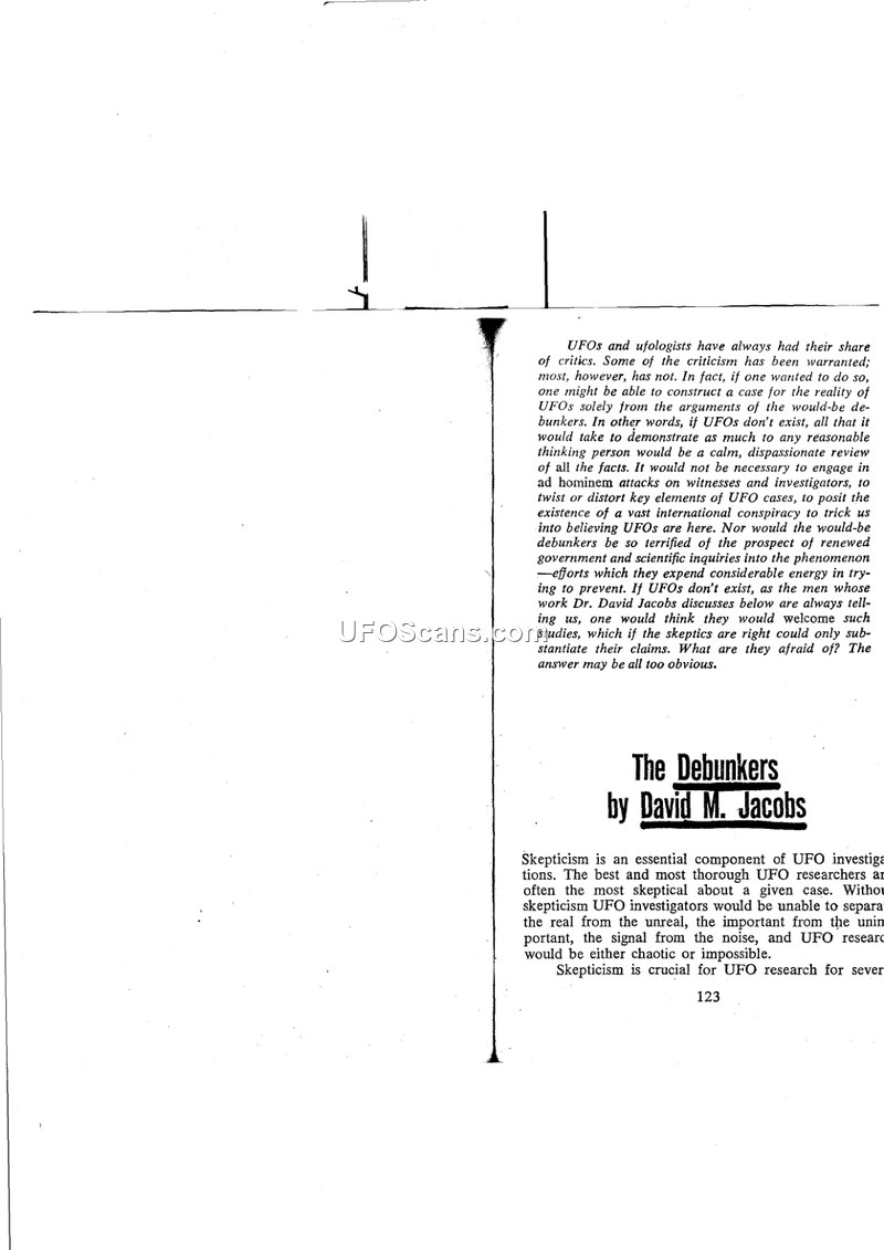 This document, titled 'The Debunkers' by David M. Jacobs, is an analytical critique of the individuals and methods used to dismiss the UFO phenomenon. Jacobs posits that skepticism is a necessary component of research, but distinguishes between legitimate scientific inquiry and 'debunking,' which he characterizes as a crusade to protect society from 'pseudoscience.' The author identifies three prominent scientists—Carl Sagan, Donald Menzel, and Edward Condon—as having expended significant effort to debunk UFOs, often through what Jacobs describes as character assassination and factual distortion. He further highlights the role of 'lay-debunkers' such as Philip J. Klass, Robert Sheaffer, and James Oberg, who are associated with the Committee for the Scientific Investigation of Claims of the Paranormal. Jacobs argues that these individuals frequently use ad hominem attacks, ignore evidence, and create straw-man arguments to maintain the position that UFOs do not exist. The text details how these debunkers often attack the credibility of UFO researchers, specifically citing the treatment of J. Allen Hynek, who was frequently targeted by critics. Jacobs suggests that the debunkers' approach is driven by a fear of the unknown and a desire to maintain a specific scientific worldview, often at the expense of objective analysis. The document concludes by drawing parallels between the anti-communist 'witch-hunts' of the 1950s and the tactics employed by modern UFO debunkers, suggesting that both have stifled free speech and rational inquiry. The text is excerpted from the 'Proceedings of the First International UFO Congress' held in Chicago in 1977.