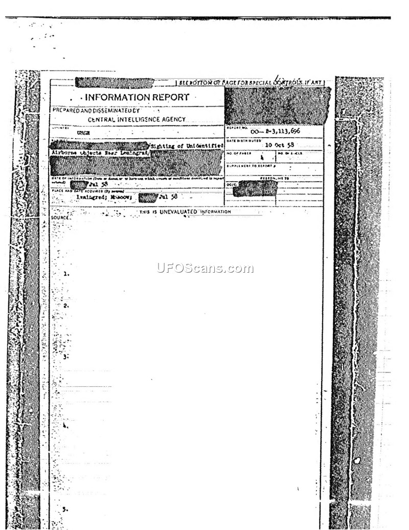 This Central Intelligence Agency information report details a sighting of two unidentified airborne objects observed on the evening of July 11, 1958, by an anonymous witness traveling by train from Leningrad to Moscow. Approximately one hour after departing the Leningrad station, the witness observed two bright lights with gray smoke trails rising vertically into the air. The witness noted that the objects remained in view for approximately 10 minutes while continuing their ascent. The witness initially brought the sighting to the attention of an Intourist guide, who dismissed the observation as a potential satellite launch. Later, while in Moscow, the witness discussed the event with a Russian-speaking tour member referred to as Ivanov. When the witness and a friend mentioned the sighting to Ivanov, he initially joked about 'flying saucers.' However, when the witness pressed the subject, Ivanov reportedly became visibly flustered, pulled the car off the road, and demanded to know what the objects looked like before abruptly changing the subject and refusing to discuss the matter further.