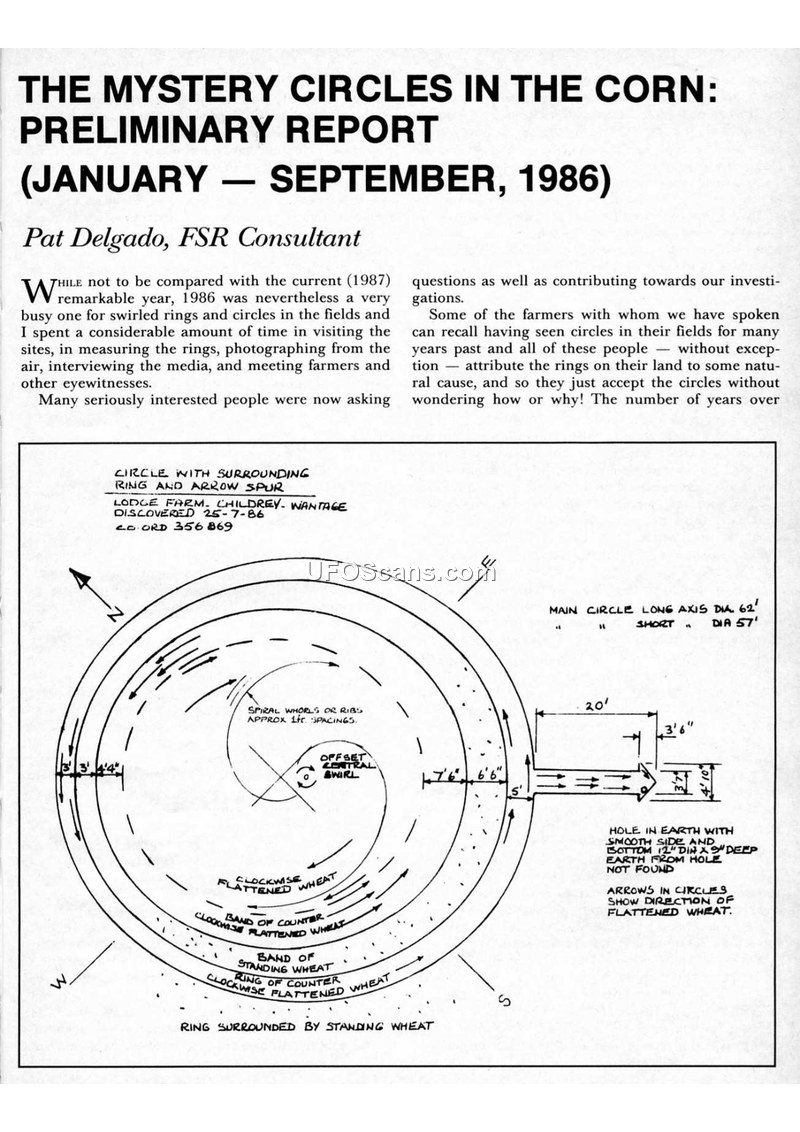 This document is a compilation of reports and articles from the Flying Saucer Review (FSR) regarding the phenomenon of 'mystery circles' or 'swirled circles' appearing in corn fields, primarily in Southern England during 1986 and 1987. The authors, Pat Delgado and Colin Andrews, both FSR consultants, document their investigations into these formations, noting their increasing complexity and frequency. The report details specific incidents, such as the 1986 circles at Headbourne Worthy and the 1985 sighting at Stockbridge Down. The authors argue that there is a strong connection between these ground formations and UFO sightings, citing eyewitness accounts of hovering, brilliantly-lit objects and radar anomalies. They also discuss the failure of conventional explanations, such as hoaxes, weather, or animal behavior, to account for the precision and characteristics of the circles. The document includes sketches of the formations and UFOs, as well as correspondence from other researchers and witnesses. The authors suggest that the circles may be created by an unknown force-field or intelligence, and they call for continued investigation and reporting of such events to build a global network of data. The document also touches upon international reports of similar phenomena, including a brief mention of UFO sightings in China.