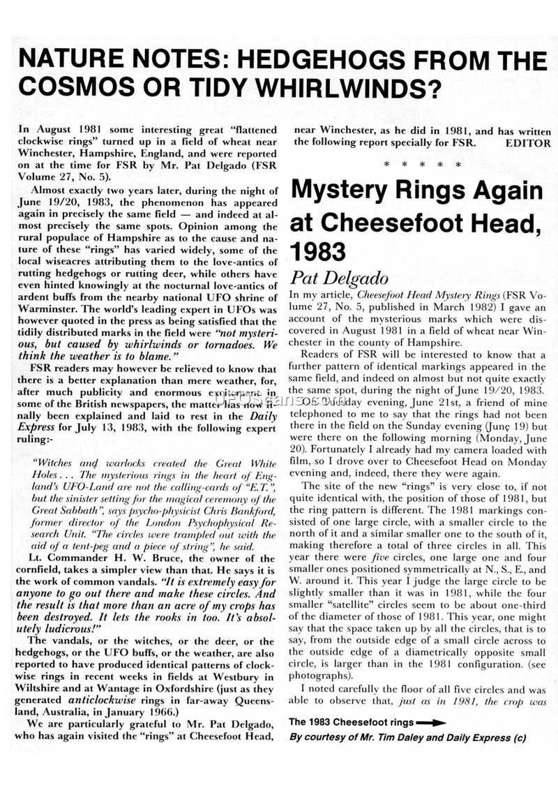 This document is a compilation of articles from the Flying Saucer Review (FSR) concerning the appearance of mysterious flattened rings in cornfields, primarily at Cheesefoot Head, Hampshire, in 1981 and 1983. The author, Pat Delgado, documents the physical characteristics of these rings, noting their sharp edges and clockwise flattened stalks. The text contrasts these findings with various official and public explanations, such as rutting animals, whirlwinds, or human vandalism, which the author finds unsatisfactory. The document also provides historical context by referencing similar phenomena in Australia, specifically the 'saucer nests' reported in North Queensland in 1966. These accounts involve witnesses like George Pedley and Louie Maule, who reported seeing saucer-shaped objects and subsequent physical traces in the vegetation. A recurring theme in the Australian reports is the suspicious loss or confiscation of photographic and film evidence by authorities, leading to speculation about government involvement or cover-ups. Additionally, the document includes a brief update on the French research body G.E.P.A.N., noting their internal memorandum regarding soil and plant anomalies found at landing sites. The compilation serves as a record of ongoing, unexplained aerial and ground-based phenomena, emphasizing the persistence of these events despite official dismissals.