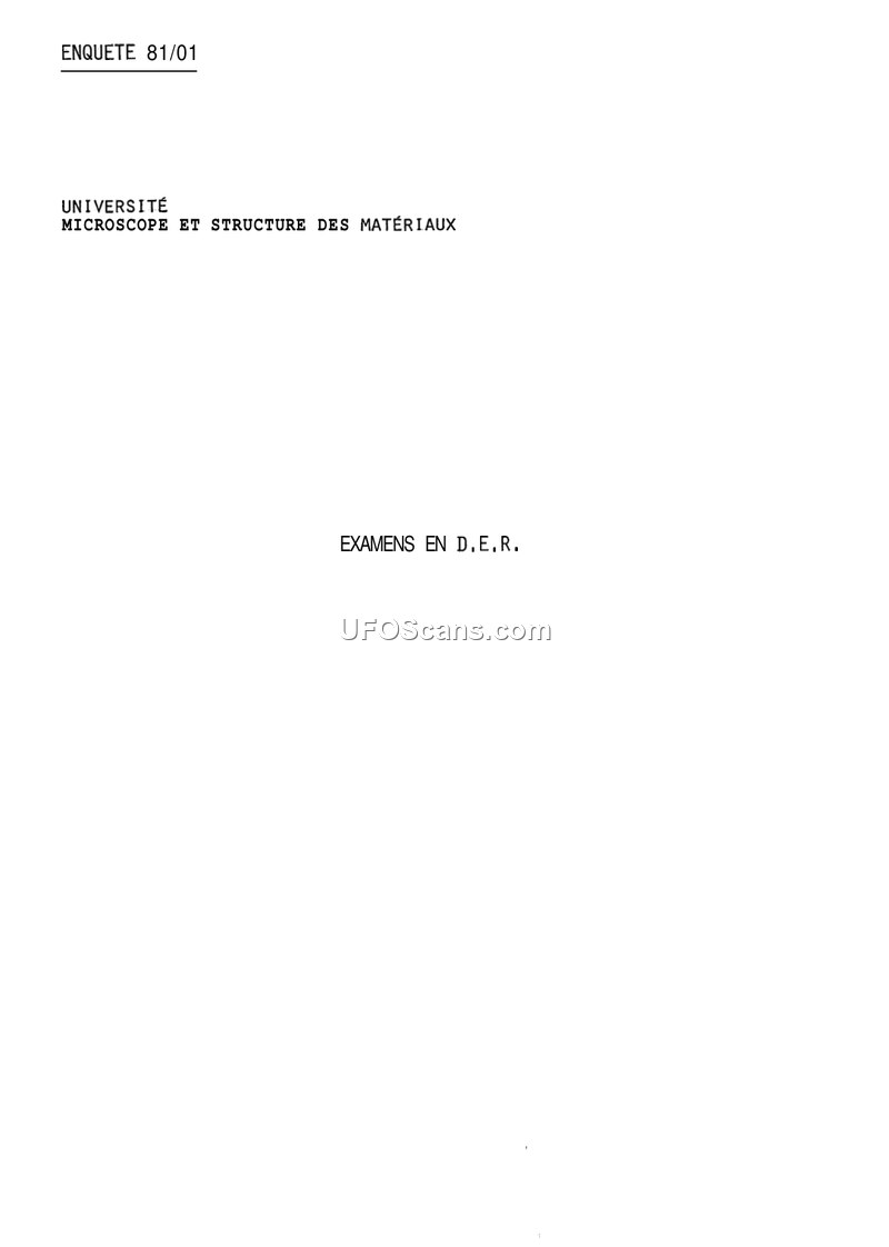 This document, dated October 12, 1981, is a laboratory report from the University's Microscopy and Structure of Materials department (ERA301) regarding the analysis of samples provided by an individual identified as 'M. V' on April 22, 1981. The investigation, titled 'Enquête 81/01', involved a comparative study between a 'reference soil' and samples taken from a 'crown' (couronne). The laboratory preparation involved diluting the materials in water, ultrasonic dispersion, and examination via electron microscopy at 80KV. The reference soil was found to be polycrystalline, composed of barium-calcium carbonate, calcium peroxide octahydrate, and iron oxide. The samples from the 'crown' contained black, brilliant, non-magnetic particles that were distinct from the reference soil. Diffraction analysis of the crown samples revealed a higher concentration of calcium peroxide octahydrate and the presence of monocrystalline structures, which were entirely absent in the reference soil. The researchers attempted to replicate the crown sample's structure by heating the reference soil to 1000°C in a vacuum, but no transformation into a monocrystalline state was observed. The report includes photographic plates (clichés) documenting the diffraction patterns of the samples.