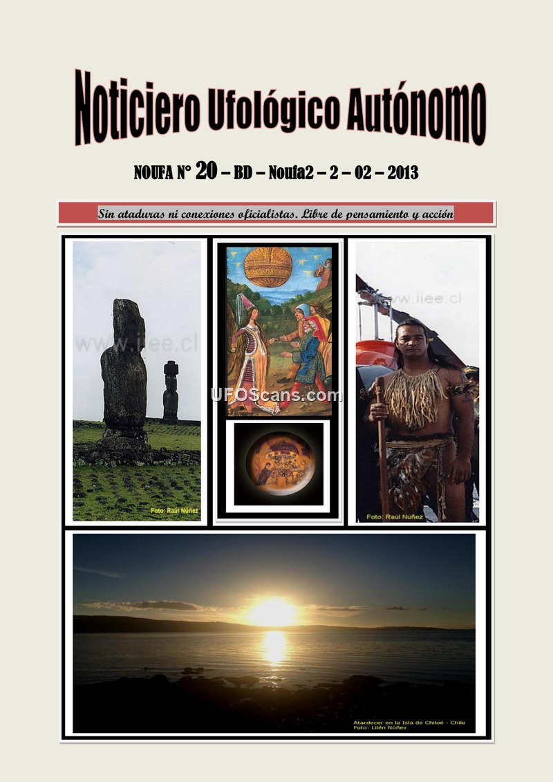 This document is the 20th issue of the 'Noticiero Ufológico Autónomo' (NOUFA), dated February 2, 2013. It serves as a compilation of articles, testimonies, and historical analyses regarding UFOs, UAP, and various unexplained phenomena. The editorial by Raúl Núñez highlights the publication's commitment to independent thought and investigation, free from official constraints. The newsletter covers a wide range of topics, including the mystery of Easter Island and its moai, the 1959 Dyatlov Pass incident in the Ural Mountains, and the legend of the Amazons as recorded by 16th-century explorers like Francisco de Orellana.
