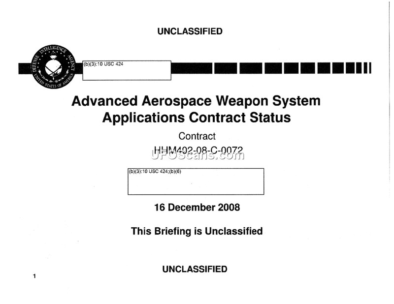 This document is an unclassified briefing dated 16 December 2008 regarding the status of contract HHM402-08-C-0072, titled 'Advanced Aerospace Weapon System Applications'. The briefing outlines the scope of the contract, which involves conducting technical studies on unconventional aerospace weapon systems with projections through the year 2050. These studies are explicitly noted as not being extrapolations of current technology. The technical areas covered include lift, propulsion, control, power generation, spatial/temporal translation, signature reduction, materials, configuration/structure, human interface, human effects, and armament (RF and DEW). The document notes that Bigelow Aerospace Advanced Space Studies submitted complete Program Management Plans for these 12 technical areas on 21 November 2008, which received DIA comment and approval. The briefing highlights that the project is on track, on schedule, and within cost. It mentions that an initial contract status brief was provided on 10 November, and the subject was raised by Senator Reid in a meeting on 13 November. The document also details the technical approaches for fiscal year 2009, which include calibrated data collection, expert access and analysis, collaboration with universities and national labs, investigation of major aerospace and electronics firms, cooperation with the intelligence community, and the use of technical peer review boards. Challenges identified include the difficulty of establishing a research effort from the ground up, specifically regarding staff, management, consultants, clearances, and facilities. Positives include the contractor's receptiveness to guidance and the quality of the Program Management Plans. The 'Way Ahead' section emphasizes the need for approval of specific topics for approximately 24 technical reports, approval of the research database architecture, approval of university and national lab grant solicitations, and the successful processing of personal and site security clearances.
