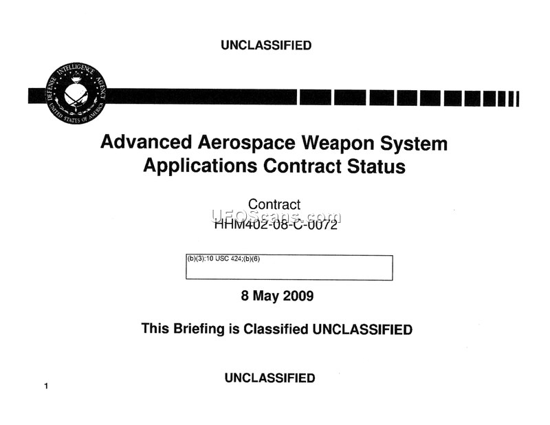 This briefing document, dated 8 May 2009, provides a status update on the Defense Intelligence Agency (DIA) contract HHM402-08-C-0072, titled 'Advanced Aerospace Weapon System Applications.' The contract was initiated following a July 2008 supplemental appropriation that tasked the DIA with studying foreign advanced aerospace weapon threats for the next 40 years. Bigelow Aerospace Advanced Space Studies LLC (BAASS) was awarded the contract and commenced work on 21 September 2008, with initial funding of $10 million in FY08. Senator Harry Reid expressed support for the contract during a meeting on 13 November 2008. The briefing confirms that the project is proceeding on schedule and within budget. The contractor is utilizing established technical approaches and has successfully processed SCI clearances for key personnel. The scope of the study focuses on unconventional aerospace weapon systems, specifically excluding extrapolations of current technology. Research areas include lift, propulsion, control, power generation, spatial/temporal translation, signature reduction, technology integration, materials, configuration/structure, human interface, human effects, and armaments such as RF and directed energy weapons. BAASS is employing technical approaches that include calibrated data collection, expert analysis, collaboration with universities and national labs, and engagement with major aerospace firms. The document notes that BAASS has been receptive to guidance and that the program management plans are of high quality. The immediate path forward involves publishing 24 technical report deliverables, continuing the development of a research database, initiating a grant solicitation program for universities and national labs, and continuing security clearance processing.