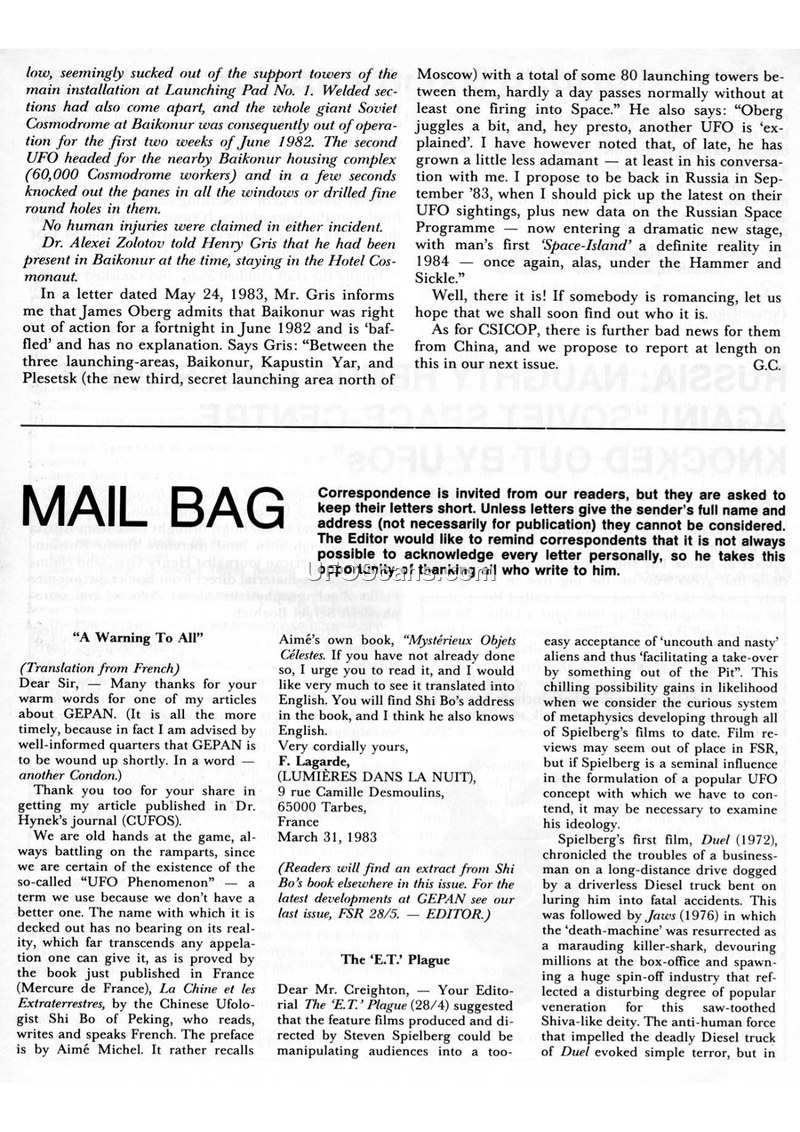 This document consists of excerpts from the 'Mail Bag' section of the Flying Saucer Review, featuring editorial commentary and reader correspondence. The text opens with a report regarding incidents at the Soviet Cosmodrome in Baikonur in June 1982. It is alleged that two UFOs caused damage to support towers and windows at Launching Pad No. 1, with reports of fine round holes drilled into the glass. Dr. Alexei Zolotov reportedly witnessed these events. The text also references correspondence with James Oberg regarding the status of the Baikonur facility. The remainder of the document focuses on cultural and academic discourse surrounding UFOs. This includes a discussion of the book 'La Chine et les extraterrestres' by Shi Bo, with a preface by Aimé Michel. There is a significant critique of Steven Spielberg’s films, specifically 'Close Encounters of the Third Kind' and 'E.T.', with the author arguing that these films manipulate audiences by presenting aliens in a way that masks a 'predatory impulse' or 'deification programme.' Finally, the document includes letters from readers, including Malcolm Dickson regarding 'Villas Boas' dolls and Keith Flitcroft, who provides commentary on a book about George Adamski and his own involvement with the Queensland Flying Saucer Bureau.