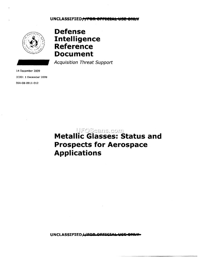 This 2009 DIA report evaluates the potential of metallic glasses for aerospace use, highlighting their high strength and processing flexibility alongside significant limitations in ductility and fatigue resistance. It identifies metallic glass matrix composites as the most viable path for future aerospace structural applications.