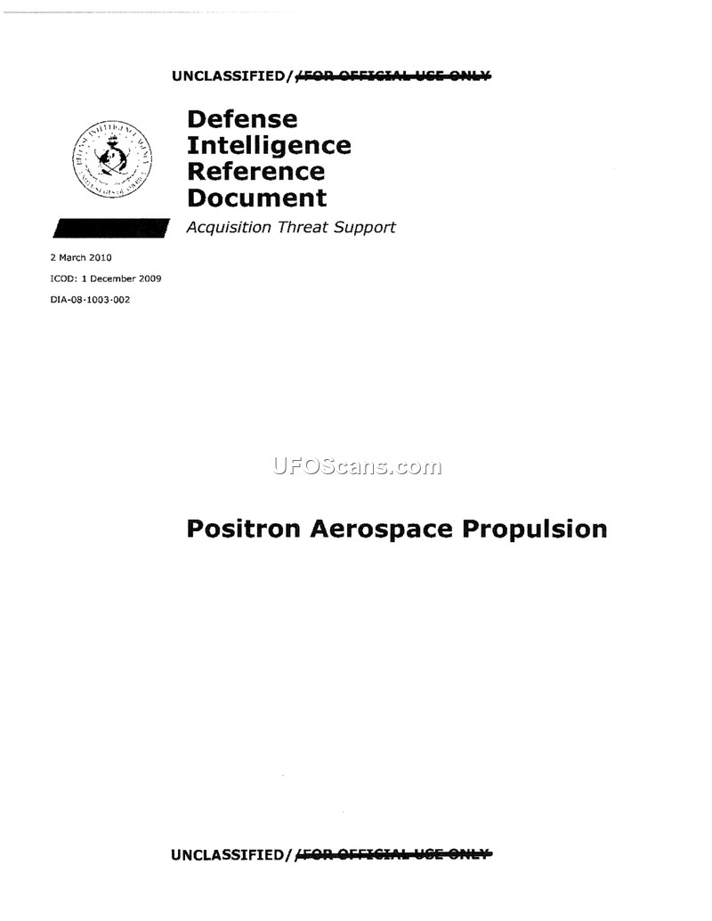 This document is a 2010 Defense Intelligence Agency reference report evaluating the feasibility of using positron annihilation for aerospace propulsion. It concludes that while technically challenging, positron-based systems offer superior energy density and safety compared to nuclear or antiproton alternatives for future space and atmospheric flight.