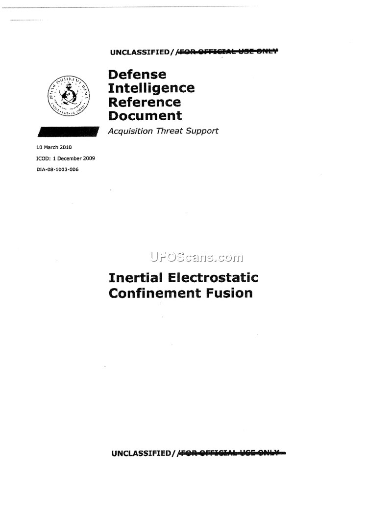 This Defense Intelligence Reference Document, produced in 2010 for the Advanced Aerospace Weapon System Applications (AAWSA) Program, provides a comprehensive overview of Inertial Electrostatic Confinement (IEC) fusion. The document details the history, theoretical foundations, experimental status, and potential applications of IEC technology, with a primary focus on research conducted at the University of Illinois Urbana-Champaign.