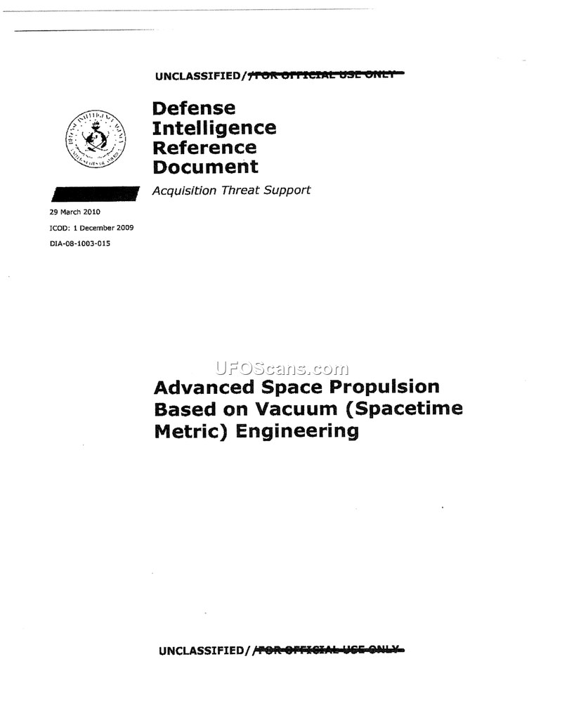 This Defense Intelligence Reference Document, produced by the Defense Intelligence Agency in March 2010 as part of the Advanced Aerospace Weapon System Applications (AAWSA) program, provides a theoretical assessment of 'vacuum engineering' for space propulsion. The document posits that the quantum vacuum, or spacetime metric, is not merely an empty stage but an energetic, structured medium that could, in principle, be manipulated to provide thrust for future spacecraft. The author employs a 'general-relativity-for-engineers' approach, utilizing the metric tensor to model how alterations in spacetime intervals—such as those found near dense masses—could be engineered to produce specific physical effects. These effects include time alteration, frequency shifting (redshifting or blueshifting), changes in effective mass, and the modification of the velocity of light within the altered region. The paper discusses how these principles could theoretically lead to advanced propulsion technologies, including the Alcubierre warp drive, which would allow a spacecraft to 'surf' on a wave of spacetime geometry, potentially achieving superluminal travel relative to an external observer. The document emphasizes that while the energy densities required for such engineering are currently beyond reach, the underlying physics is consistent with general relativity. The paper concludes that while the development of such technologies remains a long-term challenge, the theoretical framework provides a valid basis for investigating the potential for future aerospace advancements.