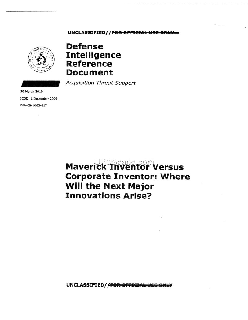 This Defense Intelligence Reference Document, produced in March 2010 for the Advanced Aerospace Weapon System Applications (AAWSA) program, provides an analytical framework for evaluating the potential for technological innovation from different types of inventors. The document distinguishes between the 'maverick inventor'—typically an independent individual or small group—and the 'corporate inventor,' who operates within large, well-funded organizations such as government laboratories, universities, or private think tanks. The author categorizes maverick inventors into five distinct types based on their level of formal training, financial resources, and group size. Types 1 and 2 are characterized as having little to no formal training and often pursue speculative, 'free-energy' or 'antigravity' concepts, frequently failing due to a lack of scientific rigor, poor measurement techniques, and reliance on non-peer-reviewed media. Types 3 and 4 are identified as having higher levels of education and a more realistic, staged approach to experimentation, making them more likely to produce viable scientific advancements. Type 5 inventors represent a hybrid, operating in small groups within larger organizational structures. The document compares these groups across several metrics, including motivation, realism, bureaucracy, and lab skills. It concludes that while corporate environments provide access to resources and business acumen, they are often stifled by internal bureaucracy and 'Not Invented Here' syndrome. Conversely, the maverick inventor is often unconstrained but lacks the necessary infrastructure for complex, high-cost research. The assessment ultimately suggests that Types 3 and 4 inventors represent the best candidates for future breakthroughs in energy and propulsion, provided they are monitored and supported with appropriate financial and technical incentives. The document emphasizes that the complexity of modern aerospace and propulsion research has shifted the burden of innovation away from the lone, untrained inventor toward those with the capacity to conduct rigorous, systematic research.