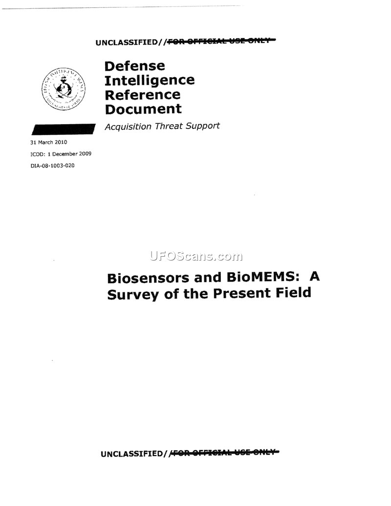 This Defense Intelligence Reference Document, produced by the Defense Intelligence Agency in March 2010 as part of the Advanced Aerospace Weapon System Applications (AAWSA) Program, provides a comprehensive survey of the field of BioMEMS (Biomedical Micro-Electro-Mechanical Systems) and biosensors. The document outlines the evolution of biomedical sensors from traditional, large-scale devices to sophisticated micro-scale technologies capable of integration within the human body. The author details the fundamental principles of BioMEMS, which leverage micro-scale fabrication techniques to manipulate fluids and electrical signals at the cellular level. Key areas of focus include brain-implanted neuroelectrodes, which allow for the monitoring of neural activity and the potential for brain-machine interfaces to assist individuals with disabilities. The report also covers fluidic BioMEMS, such as drug-delivery pumps for the treatment of conditions like diabetes, and various biosensors designed for real-time blood chemistry analysis. Significant attention is given to the challenges of biocompatibility, long-term stability, and the hostile environment of the human body, which often leads to device degradation or encapsulation by scar tissue. The document also explores the role of NASA in supporting research into microfluidic systems for space applications, specifically for monitoring cell cultures under the stresses of space flight. The survey concludes that while the field is currently in its early stages, the rapid pace of development suggests that future medical treatments will increasingly rely on these miniaturized devices. The document includes numerous figures illustrating the mechanical and electrical designs of these sensors, many of which were developed in collaboration with Arizona State University and Sandia National Laboratories.