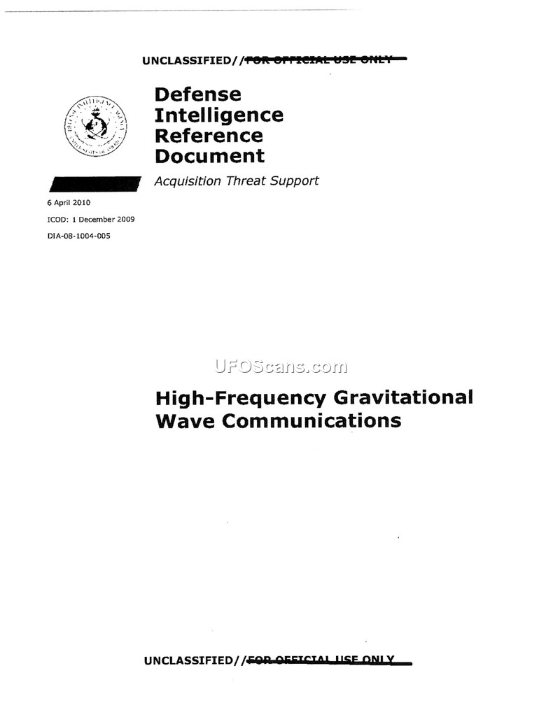 This Defense Intelligence Reference Document, produced under the Advanced Aerospace Weapon System Applications (AAWSA) Program in 2010, provides a comprehensive technical overview of the potential for high-frequency gravitational wave (HFGW) communications. The document posits that HFGWs, which are gravitational waves with frequencies higher than 100 kHz, could revolutionize telecommunications by providing a wireless system capable of transmitting information directly through the Earth without attenuation or the need for traditional infrastructure like fiber optic cables or satellite transponders.