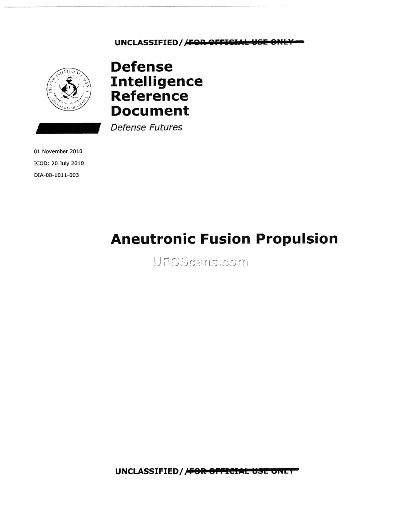 This Defense Intelligence Reference Document, dated November 1, 2010, provides a technical overview of aneutronic fusion propulsion as a potential solution for the limitations of existing chemical and nuclear fission rocket technologies. The document outlines the theoretical foundations of space propulsion, emphasizing the constraints imposed by the Tsiolkovsky rocket equation and the relativistic mass increases encountered as objects approach the speed of light. It evaluates various propulsion methods, including chemical rockets, ion drives, and nuclear fission, noting that while fission rockets provide significant thrust, they present severe radiation hazards and radioactive contamination issues. The core of the report focuses on aneutronic fusion—fusion reactions that do not produce neutrons—as a cleaner, more efficient alternative for long-duration spaceflight. The document details several fusion initiation methods, such as gravitational, magnetic, and inertial confinement, and highlights specific aneutronic schemes, particularly those involving hydrogen-1 and boron-11. It also discusses the potential of antimatter propulsion, noting its superior energy density but acknowledging the extreme difficulty in generating and storing sufficient quantities of antimatter. The report reviews several commercial and research-led projects, including the work of Dr. Robert Bussard and the EMC2 Fusion Development Corporation, as well as concepts from the European Space Agency and various U.S. government entities. The document concludes that while these technologies are currently in the conceptual or experimental stage, they represent the necessary path forward for human exploration of the solar system and beyond, provided that significant research is conducted over the next 20 to 30 years to overcome challenges in fusion initiation, material science, and high-tesla electromagnet generation.