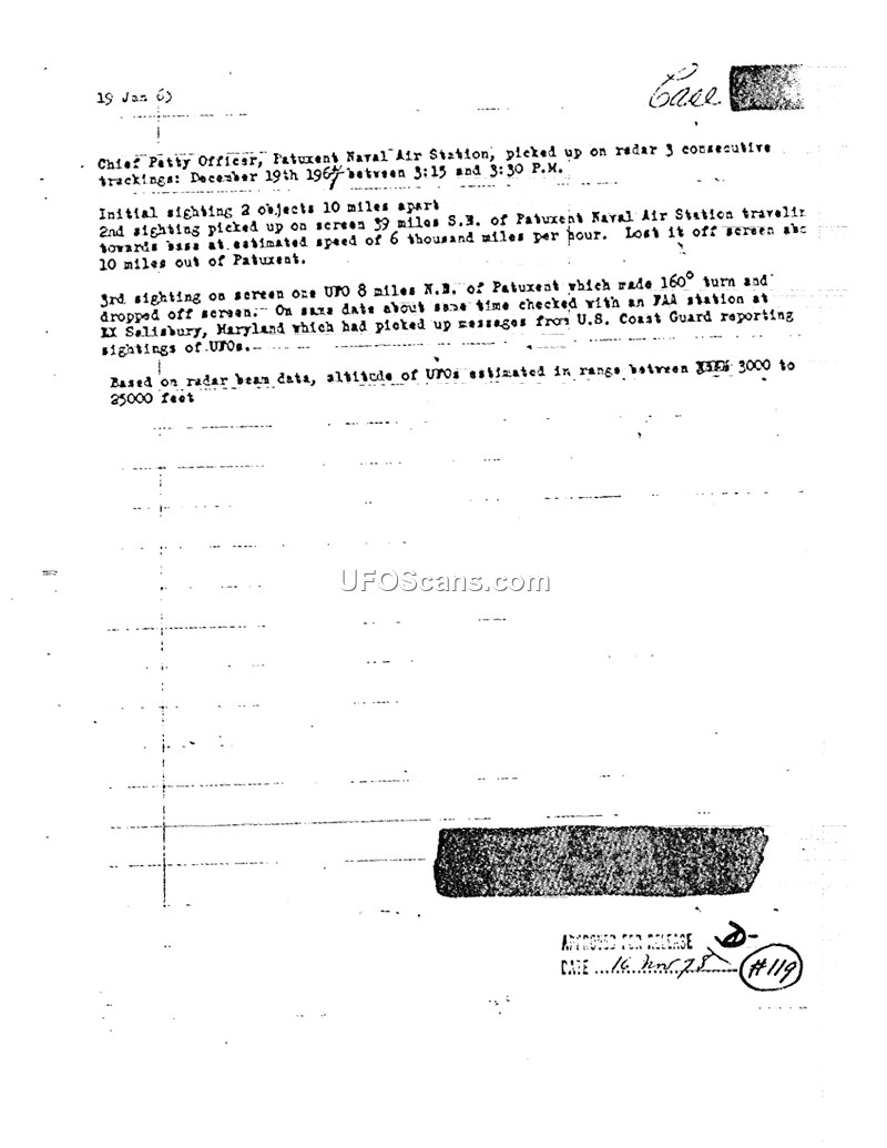 A report of radar-tracked unidentified objects near Patuxent Naval Air Station on December 19, 1967. The objects exhibited high speeds and unusual maneuvers before disappearing from radar.