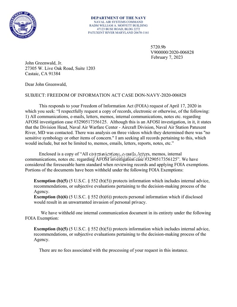 This document is a formal response from the Department of the Navy, Naval Air Systems Command, to a Freedom of Information Act (FOIA) request submitted by John Greenwald, Jr. on April 17, 2020. The request sought records, including communications and internal notes, regarding AFOSI investigation case #3290517356125, which involved the analysis of three videos by the Naval Air Warfare Center - Aircraft Division. The Navy provided the requested records, though some portions were withheld under FOIA Exemptions (b)(5) and (b)(6), citing the protection of internal advice, recommendations, and personal privacy. The document includes a series of internal email exchanges from March 2018, which detail the process of reviewing cockpit videos for classification. These emails show that personnel were coordinating with the DITMAC Office and the EO/IR IPT leads to determine the classification status of videos referred to as 'FLIR 1' and 'GoFast'. The consensus reached by the Radar and EO/IR leads was that the videos were unclassified, as they contained no sensitive symbology or other items of concern. The correspondence also highlights the administrative procedures for handling these files on secure networks (SIPRNET) and the request for further reviews of additional public domain videos. The document concludes with instructions for the requester on how to appeal the decision if desired.