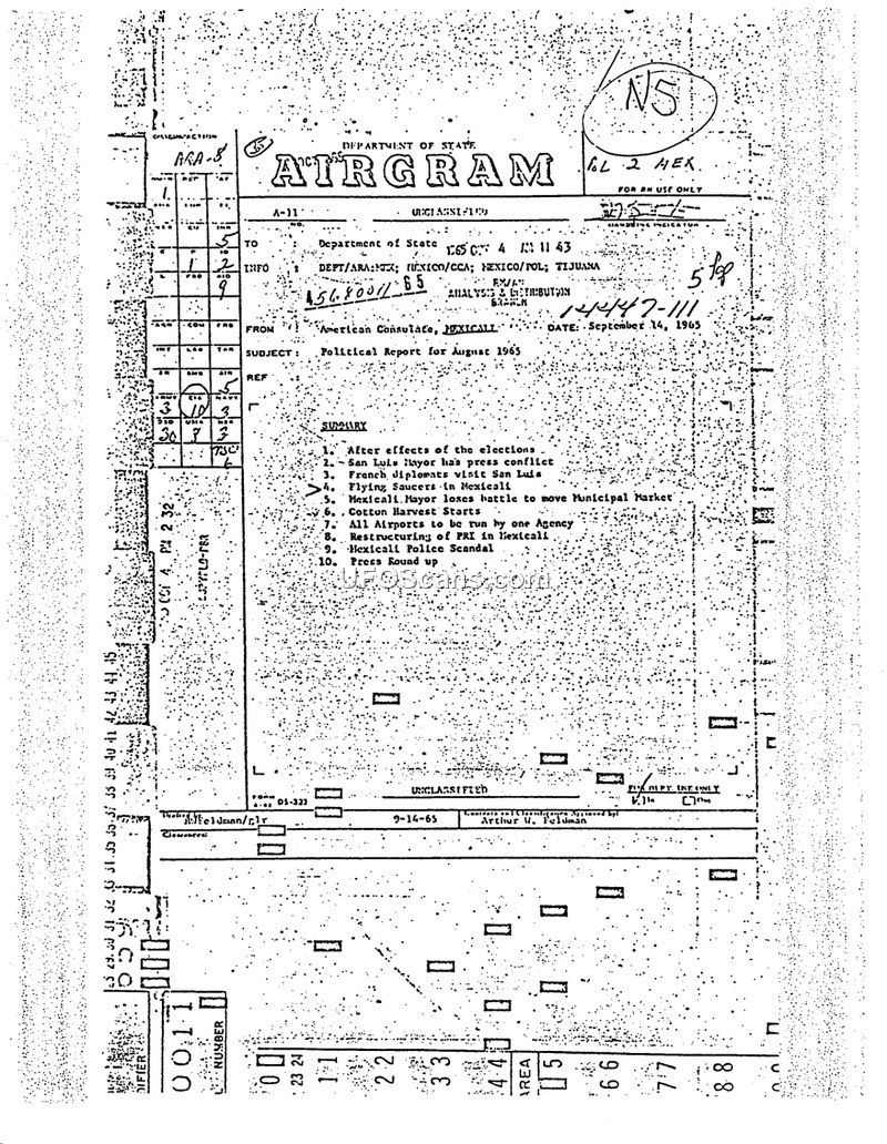 A September 1965 political airgram from the American Consulate in Mexicali lists 'Flying Saucers in Mexicali' as one of ten significant regional events for the month of August 1965.