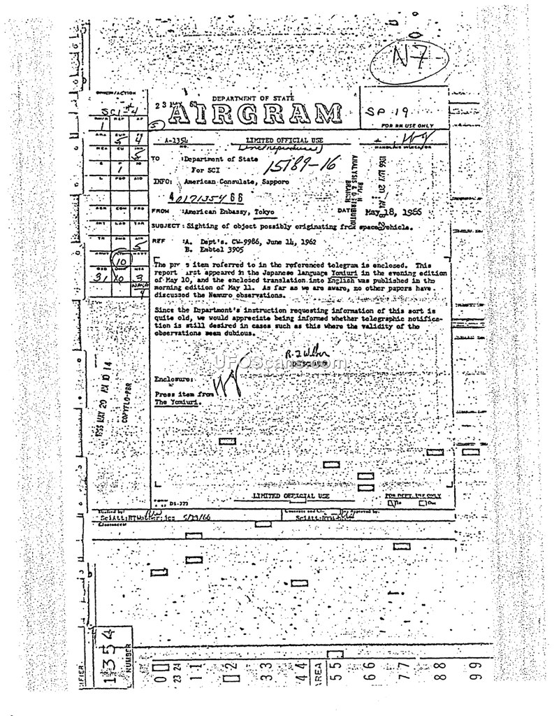This 1966 Airgram from the American Embassy in Tokyo addresses a 1962 newspaper report regarding a potential space vehicle sighting in Nemuro, Japan. The Embassy dismissed the validity of the observations as dubious.
