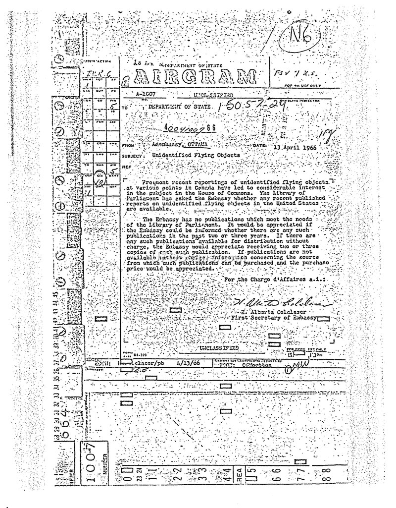 This document is an official airgram from the American Embassy in Ottawa, dated April 13, 1966, addressed to the Department of State. The correspondence notes that there have been frequent reports of unidentified flying objects at various locations across Canada. These reports have generated significant interest within the Canadian House of Commons. Consequently, the Library of Parliament requested that the Embassy provide information regarding any recent publications on the subject of unidentified flying objects that may have been released in the United States. The Embassy reported that it did not possess any such publications that would meet the specific needs of the Library of Parliament. The author, H. Alberta Colclaser, First Secretary of the Embassy, requested that the Department of State inform the Embassy if any relevant publications had been released within the previous two or three years. Furthermore, the Embassy requested information on the sources and purchase prices for such materials if they were not available for free distribution.