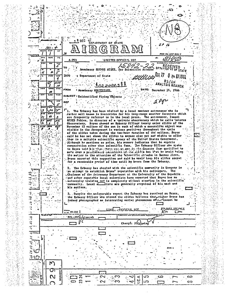 This Department of State Airgram, dated December 19, 1966, details a report from an amateur astronomer in Montevideo, Uruguay, named Ismael Reyes Febles. Reyes, the director of the private 'Antares Observatory,' claimed to have captured photographs of a saucer-like object during the solar eclipse on November 12, 1966. He presented twenty color slides to the U.S. Embassy, showing the object in various positions throughout the two-hour duration of the eclipse. Reyes indicated he was not seeking financial compensation, but rather scientific recognition. The Embassy conducted an inquiry with the University of the Republic and other local scientists, who stated that Reyes lacked formal university training and was not considered a credible member of the scientific community. Despite this unfavorable assessment, the Embassy officer who viewed the slides concluded that Reyes had indeed captured an interesting aerial phenomenon, though the document cuts off before providing a definitive explanation. The Embassy advised Reyes that there were no local experts qualified to assess the slides and suggested forwarding them to the Scientific Attaché in Buenos Aires, a proposal to which Reyes agreed.