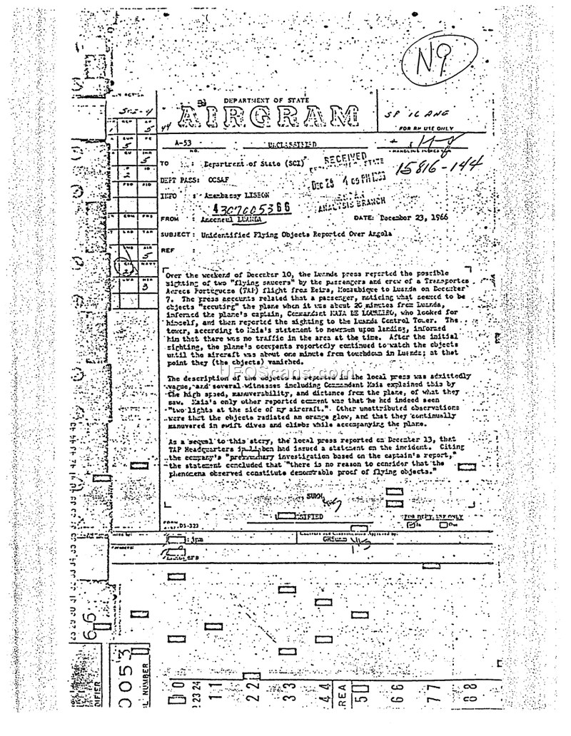 This Department of State airgram, dated December 23, 1966, details a reported sighting of unidentified aerial phenomena over Angola. On the weekend of December 10, 1966, passengers and crew aboard a Transportes Aereos Portugueze (TAP) flight traveling from Beira, Mozambique, to Luanda, Angola, observed two 'flying saucers.' The captain of the aircraft, Commandant Kata Es Loureiro, was alerted to the objects and observed them personally. According to the report, the objects exhibited an orange glow and performed swift maneuvers, including dives and climbs, while accompanying the aircraft for approximately 20 minutes. Upon landing in Luanda, the captain contacted the Luanda Control Tower, which confirmed that there was no other air traffic in the area at the time. The incident received local press coverage, during which witnesses, including the captain, described the objects. Following the reports, TAP Headquarters conducted a preliminary investigation. On December 13, the company issued a statement concluding that the phenomena observed did not constitute demonstrable proof of flying objects.