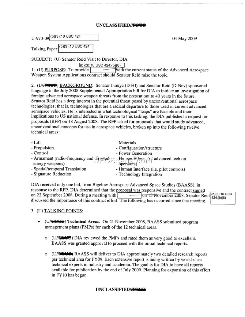 This document is a talking paper dated 04 May 2009, prepared for a visit by Senator Reid to the Director of the Defense Intelligence Agency (DIA). The primary purpose of the document is to provide a status update on the Advanced Aerospace Weapon System Applications contract. The contract originated from language sponsored by Senator Inouye and Senator Reid in the July 2008 Supplemental Appropriation bill, which tasked the DIA with investigating foreign advanced aerospace weapon threats. The DIA issued a request for proposals in August 2008, covering twelve technical areas including lift, propulsion, control, armaments, spatial/temporal translation, signature reduction, materials, configuration/structure, power generation, human effects, human interface, and technology integration. Bigelow Aerospace Advanced Space Studies (BAASS) was the sole bidder and was awarded the contract on 22 September 2008. By May 2009, BAASS had submitted program management plans for all twelve technical areas, which the DIA rated as very good to excellent. BAASS was tasked with delivering two detailed research reports per technical area for FY09, with the goal of having all reports available by the end of July 2009. The document notes that the contract is on track and within budget. Furthermore, the DIA has commenced a FY10 university grant program for advanced aerospace research. The DIA views the contract as a unique opportunity to understand advanced aerospace technology and its threat potential, with plans to integrate efforts with ONI and NASIC.